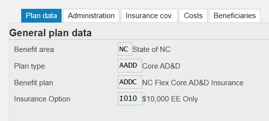 Benefits area   Specifies the highest-level subdivision of benefits data, which is the State of North Carolina.