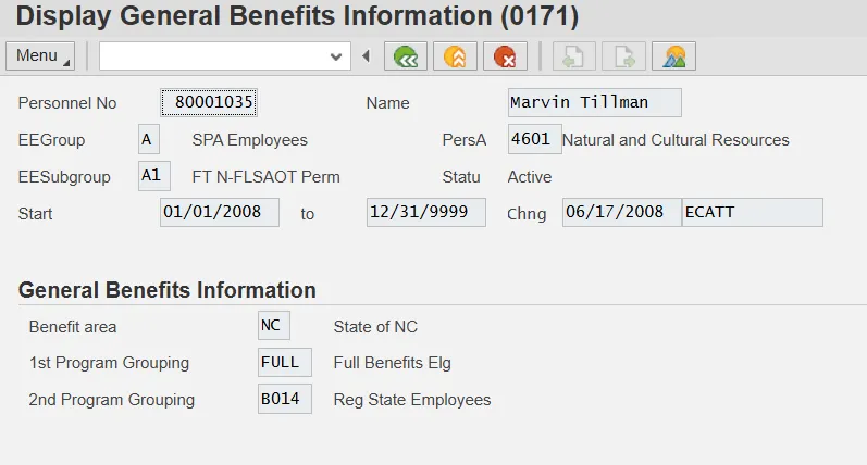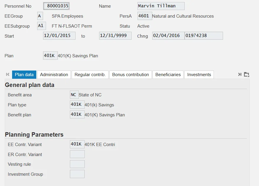 Note: Usually, changes will not be made to this infotype.  It is automatically created and updated by enrollment procedures.