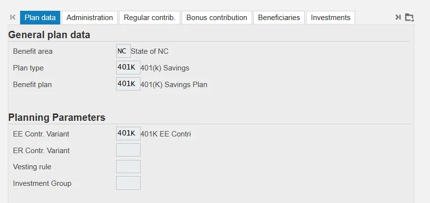 The Plan data tab shows how the plan fits into your benefit structure.  It stores the contribution rule variants, vesting rules, and investment group for the plan.