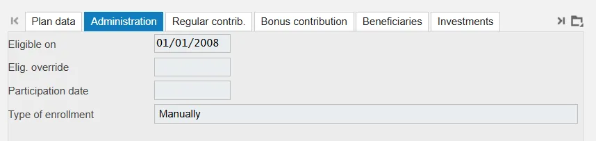 The Administrative data tab is created by the system at enrollment. It shows the eligibility status for the plan.