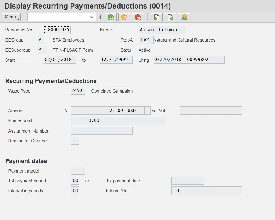 Recurring Payments/Deductions, IT0014 - You can enter an amount and/or a value and a unit of measurement for a wage type that is always paid or deducted during payroll accounting.  Recurring Payments or deductions are wage elements that are not paid or deducted in every payroll period. In contrast to additional payments, recurring payments/deductions are paid or deducted with a defined periodicity.