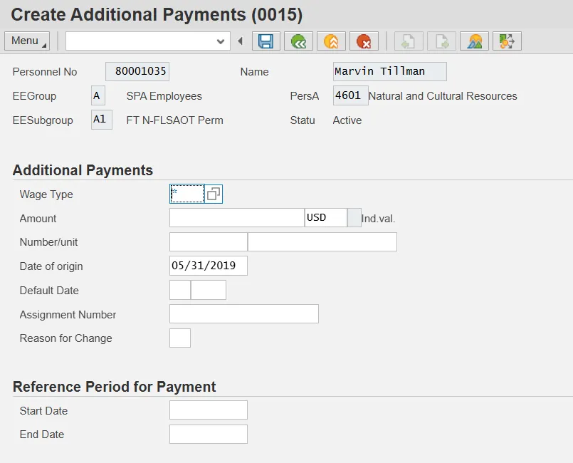 Additional Payments, IT0015 - You can store an amount and/or a value and a unit of measurement that should be paid or deducted in a certain period by Payroll. Additional payments are wage elements which are not paid or deducted in every payroll period in contrast to recurring payments and deductions which are paid or deducted within a defined period.