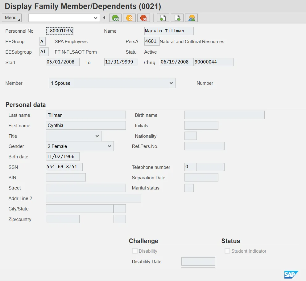 There are seven entries for the subtype for this infotype including spouse, child, legal dependent, stepchild, divorced spouse, foster child, and court-ordered dependent. These family members are available as dependents.