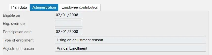 The Administration data tab is created by the system at enrollment. It shows the eligibility status for the plan.