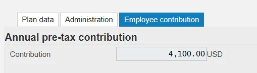 The Employee contribution tab shows the annual pre-tax contribution made on regular payroll runs.