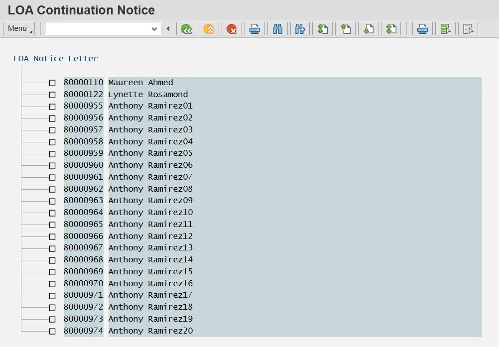 - No LOA found - Employee is not currently on a Leave of Absence. Check IT0000 for last action on file.