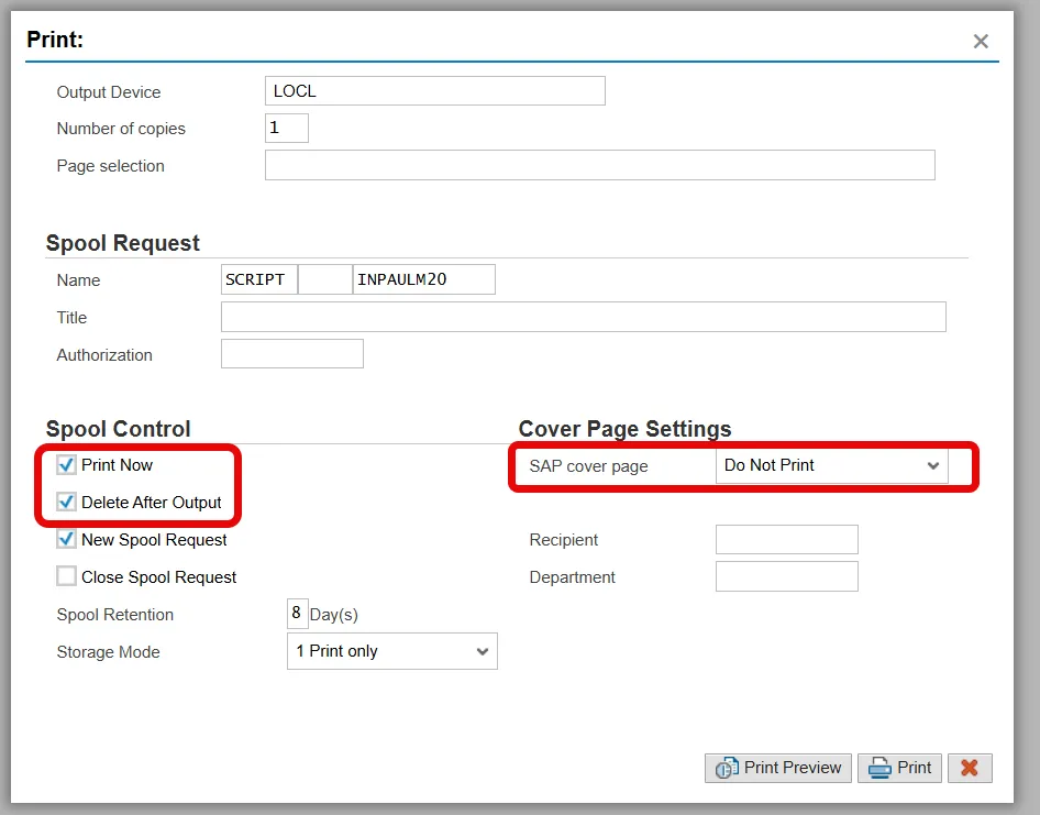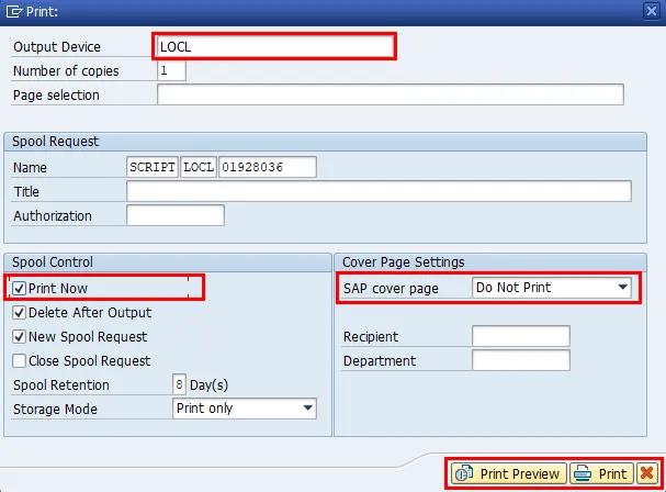 Note: Option, selecting ZLOCL as the output device will allow the header and footer information to print as designed.