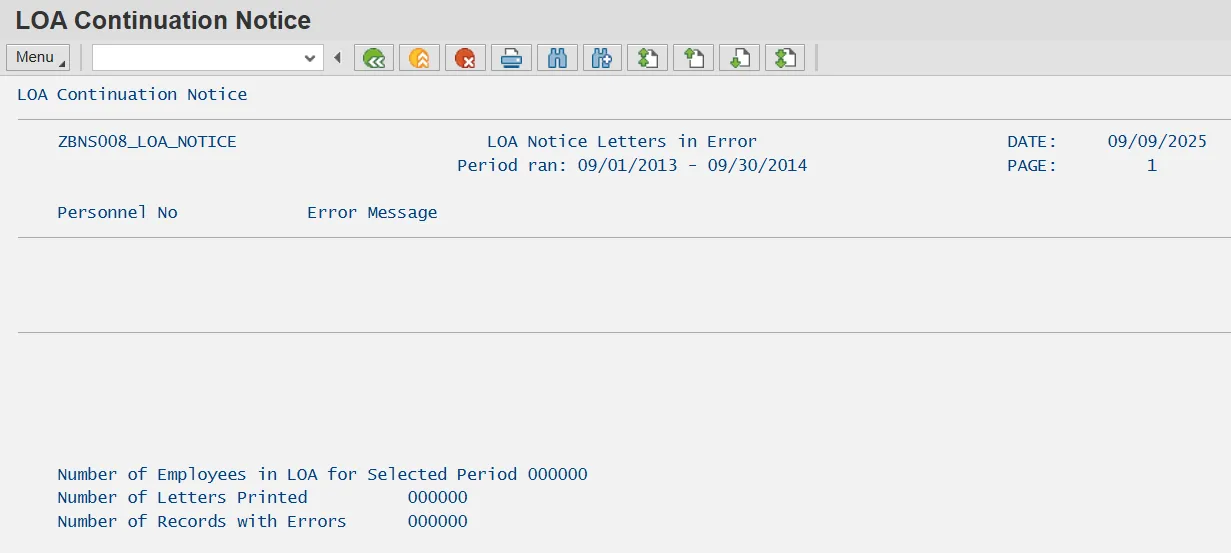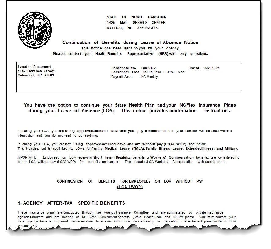 Representative notifies employee of right to continue benefits while on leave by generating the ZBNS008 - Leave of Absence Notice Letter to send to the employee. The Continuation of Benefits During Leave of Absence Notice Letter will list the plans and addresses for remitting payment to continue coverage.