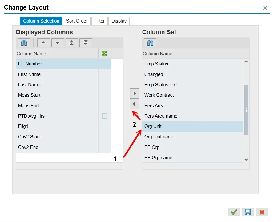 Tip: Additional fields can be added to the report results, such as Org Unit, Personnel Area, the EE’s address, etc. Click the Change Layout button, select a field from the Column Set, and click the Show Selected Fields button. Then click the Green Check button.