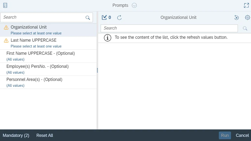 This report is generated after selecting values for the mandatory prompts.  All mandatory prompts must have values selected before the Run Icon can be used to generate the report. Mandatory prompts can be identified as mandatory by the exclamation mark inside of the yellow-orange triangle, the square with the checkmark, or the display of (Mandatory).  Detailed instructions for interaction with each prompt can be found on the Web Intelligence Prompt List on the OSC website.
