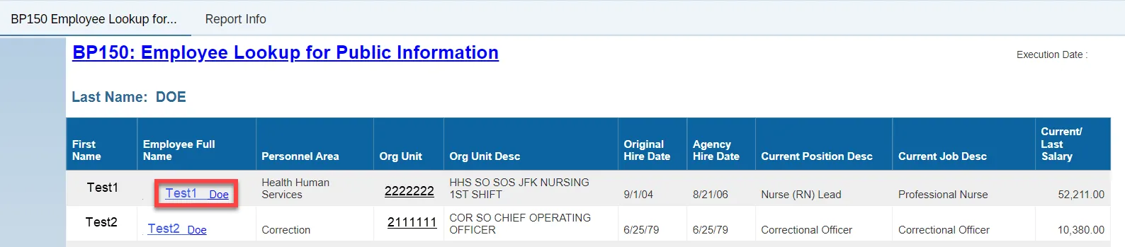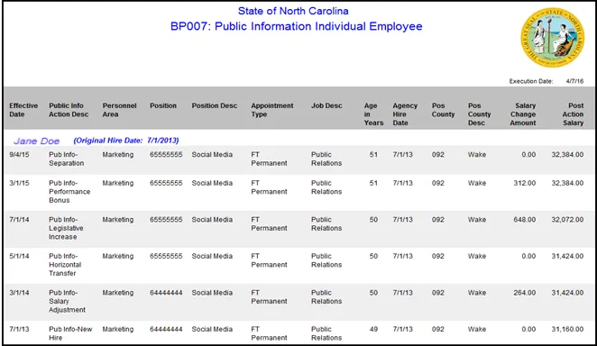 Agencies use this report to look up a particular employee and then launch report ‘BP007: Public Information Individual Employee’ to obtain the employee’s Public Information reportable action history.