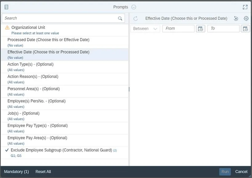 - If you search for any values in the Optional Prompts without first entering Prompt Values for Organizational Unit AND Processing Date or Effective Date, then the search will not return any values.