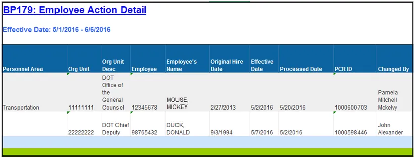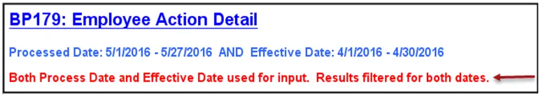 This report shows employee action detail & action count for a specified Effective Date range or Processed Date range and includes Integrated HR-Payroll actions and PMIS converted actions. Provides jump to B0022: Comments report.