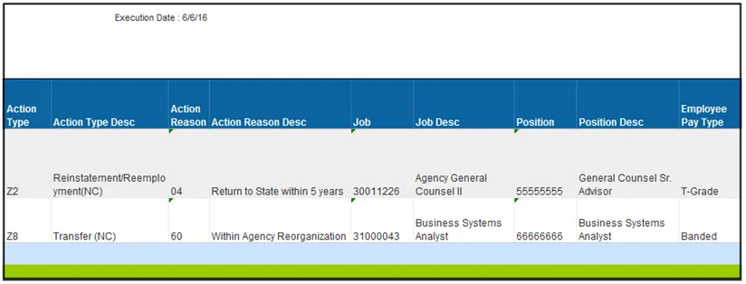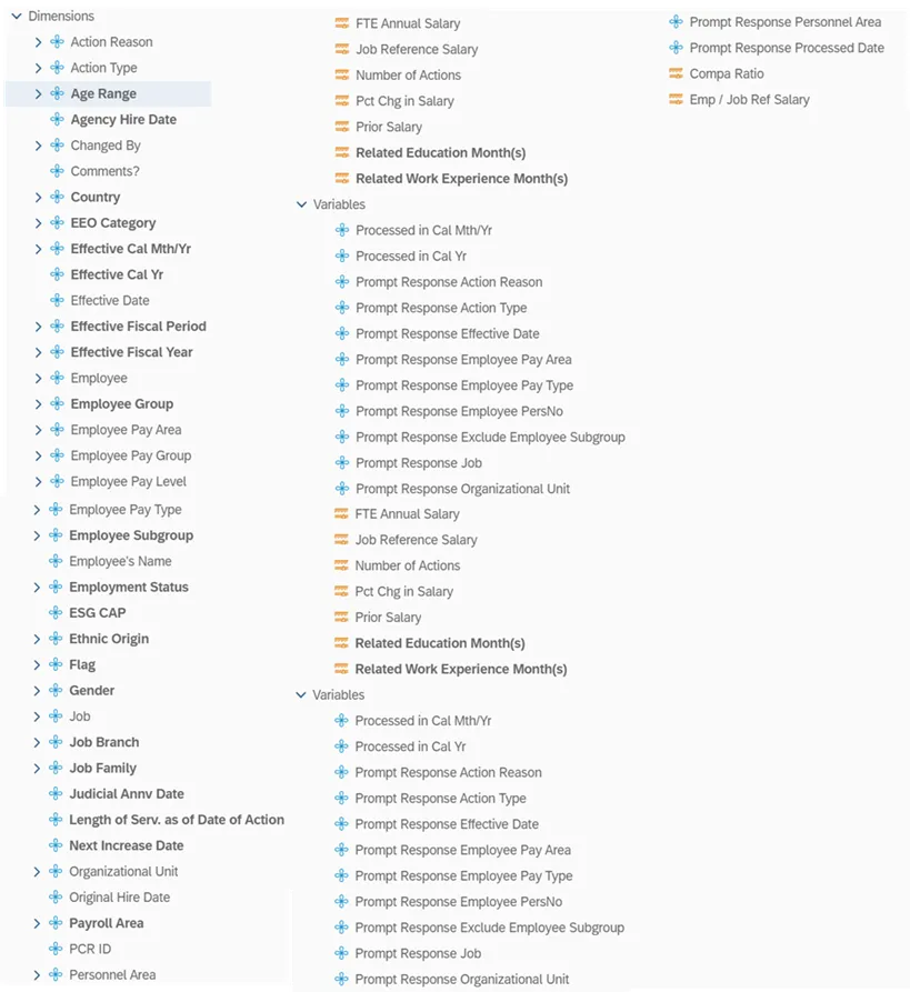 - When there are multiple salary changing actions with the same Effective Date, the Infotype 0008 change history table is reviewed to determine which salary change went with which action. However, if for some reason the number of actions does not equal the number of IT0008 change records for that same date, then we are unable to determine which action caused what salary change. So, the most recent IT0008 salary is shown for all actions on that day. When this scenario happens, the action records will be flagged, and the “Flag” data element (from Available Objects) will show an ‘X’ value to signify this.