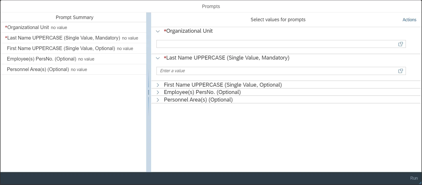 This report is generated after selecting values for the mandatory prompts.  All mandatory prompts must have values selected before the Run Icon can be used to generate the report. Mandatory prompts can be identified as mandatory by the exclamation mark inside of the yellow-orange triangle, the square with the checkmark, or the display of (Mandatory).  Detailed instructions for interaction with each prompt can be found on the Crystal Report Prompt List on the OSC website.