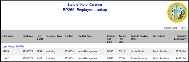 The report lists current information for all employees corresponding to the Last Name selected.  Below is a sample rendering.