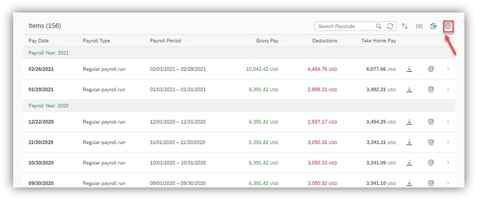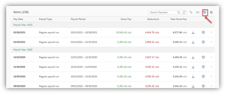 Step 15. Click the Sort your paystubs icon to sort pay statements within the timeframe.