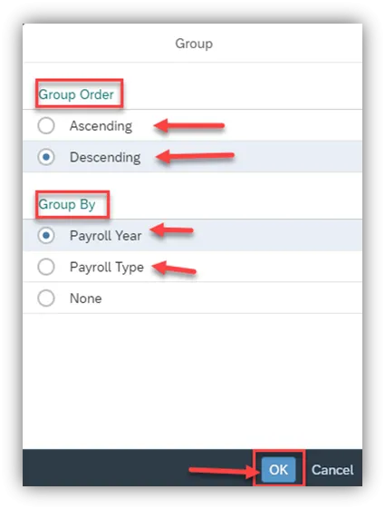 Step 14. Adjust the Group Order to Ascending or Descending or the Group By to Payroll Year, Payroll Type, or None and click OK.