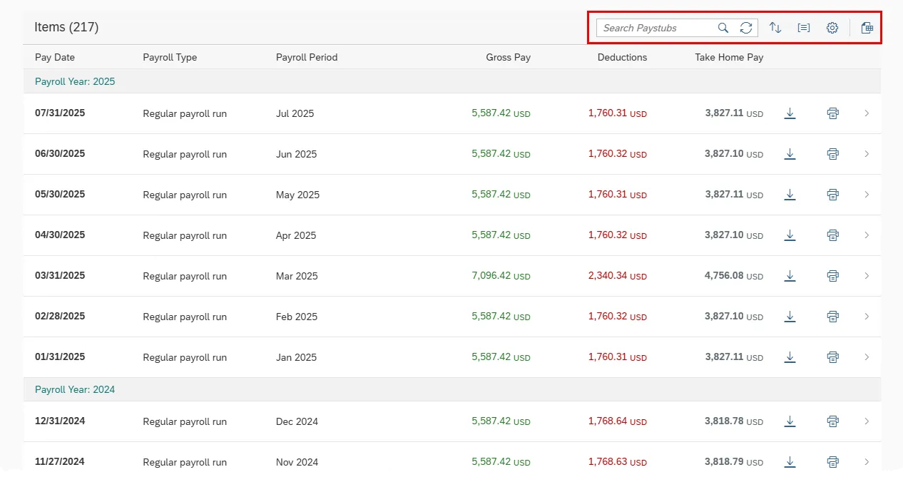 Step 3. To filter on a specific year of pay statements, go to the Search Paystubs field and type in a year. For example, type in “2019” and click Enter on your keyboard or click the Search magnifying glass icon.