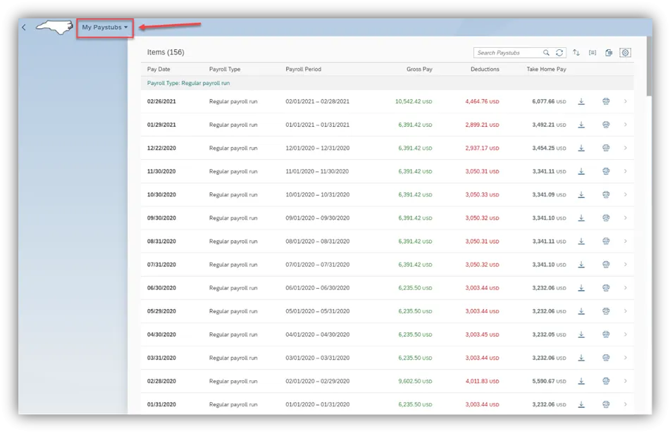 Step 5. To download a specific pay statement, click the Download PDF arrow in a column on the right side of the screen.