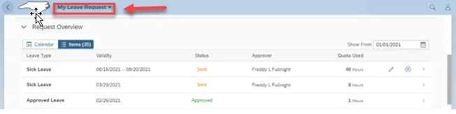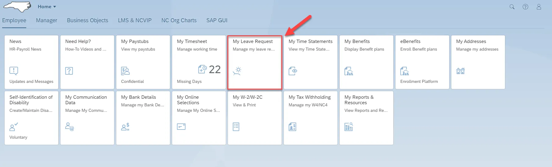 Step 1.    Click on the My Leave Request tile to access the Leave Request app.