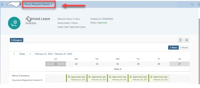Step 16.    To navigate back to the previous screen, click Show Request Details. Then click My Leave Request from the drop-down.