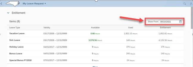 Step 3.    Various leave balances for an employee show up under Entitlement.