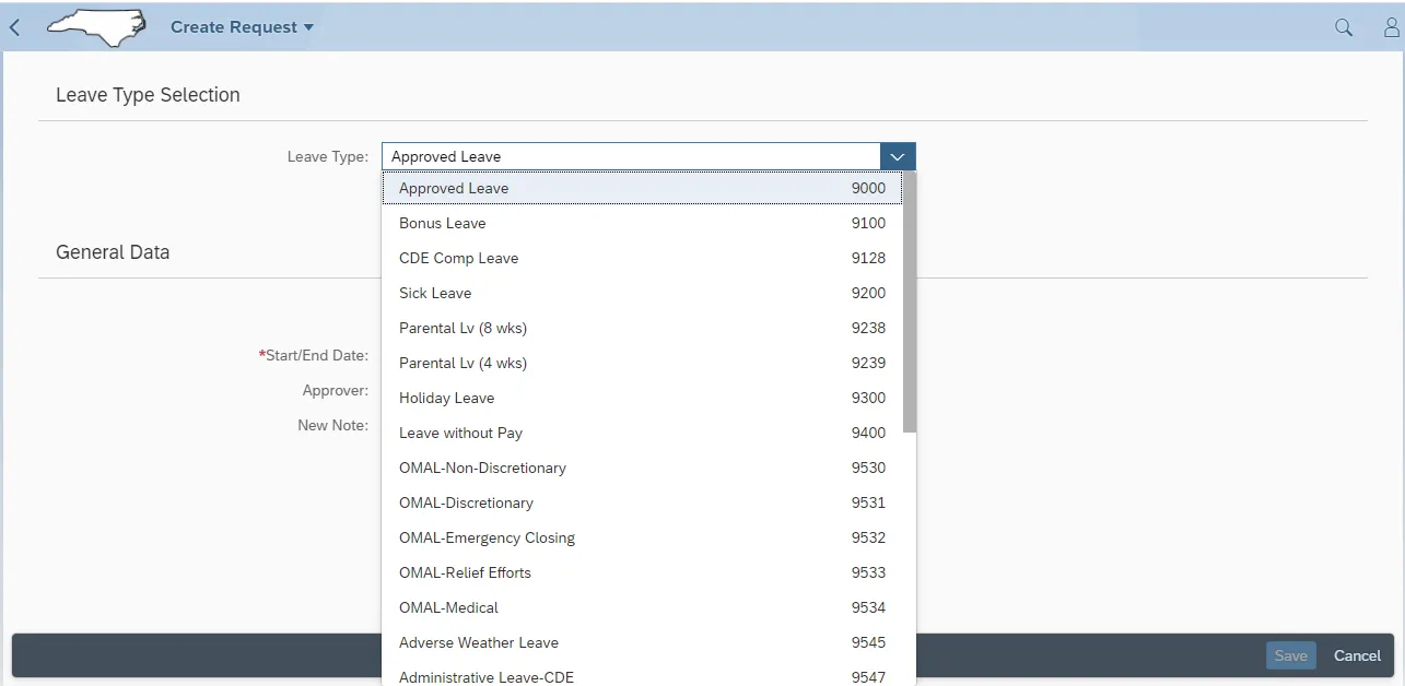 Step 18.    From the create screen, select the Leave Type from the drop-down. Please note: The Leave Type, as shown on the initial Leave Request dashboard, details leave types independently. In this example, Approved Leave consolidates all approved leave quotas, or leave types, such as OT Comp, Holiday Comp, and Vacation. The total number of available hours reflects the consolidated total for all approved leave quotas or leave types.