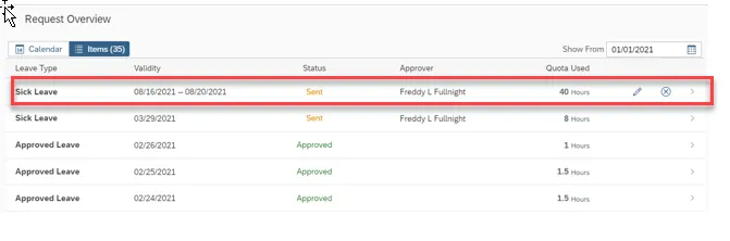 Step 25.    When the leave request is saved, it appears as a new entry under Request Overview. It is a leave request for a future date, and it can be edited or deleted. The edit and delete options are to the right.