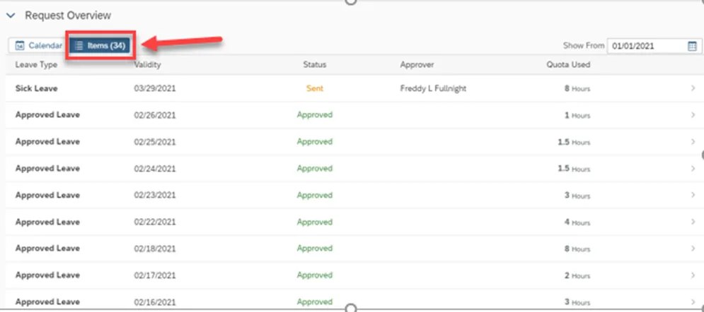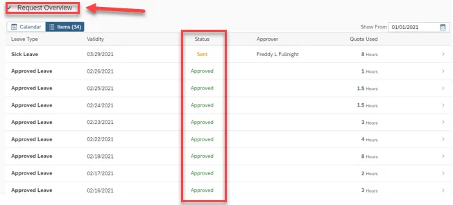 Step 4.    Request Overview is a list of an employee’s requests for leave and the Status of those requests.