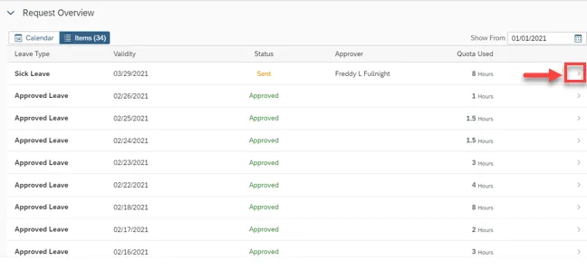 Step 7.    Click the arrow to see additional details for a leave request. Only leave requests for future dates can be edited or deleted.