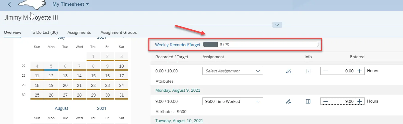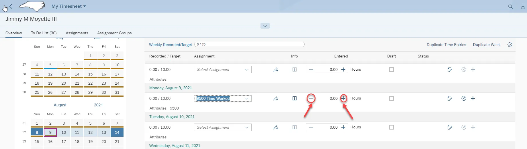 Step 11. Enter time worked by manually entering the hours or clicking the “+” or “-“ buttons. Notice the weekly Recorded/Target bar is dynamic as you add or subtract the hours.