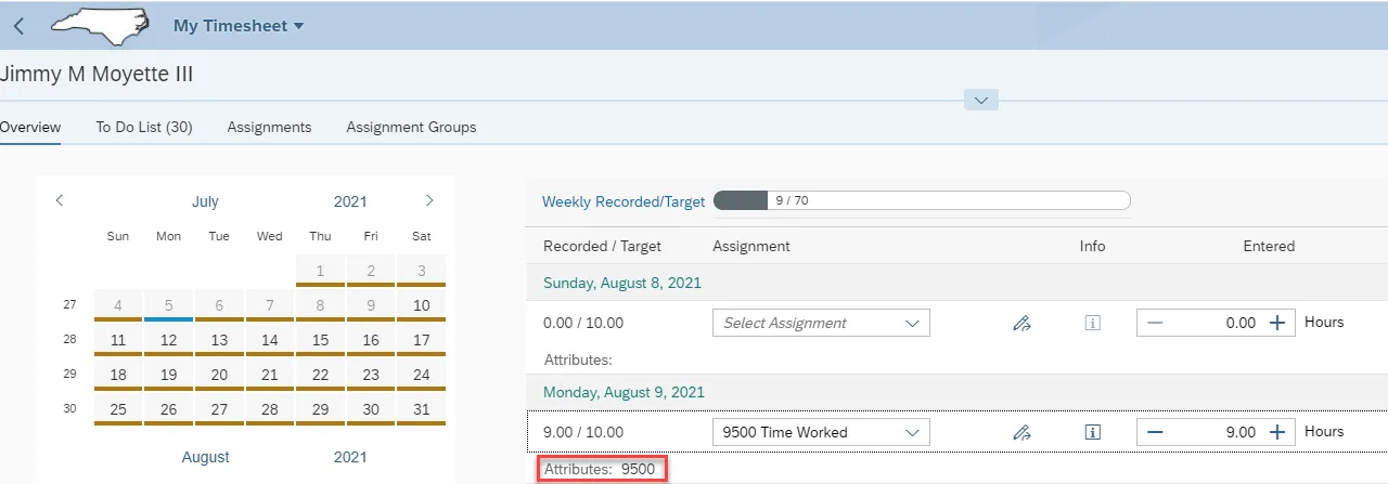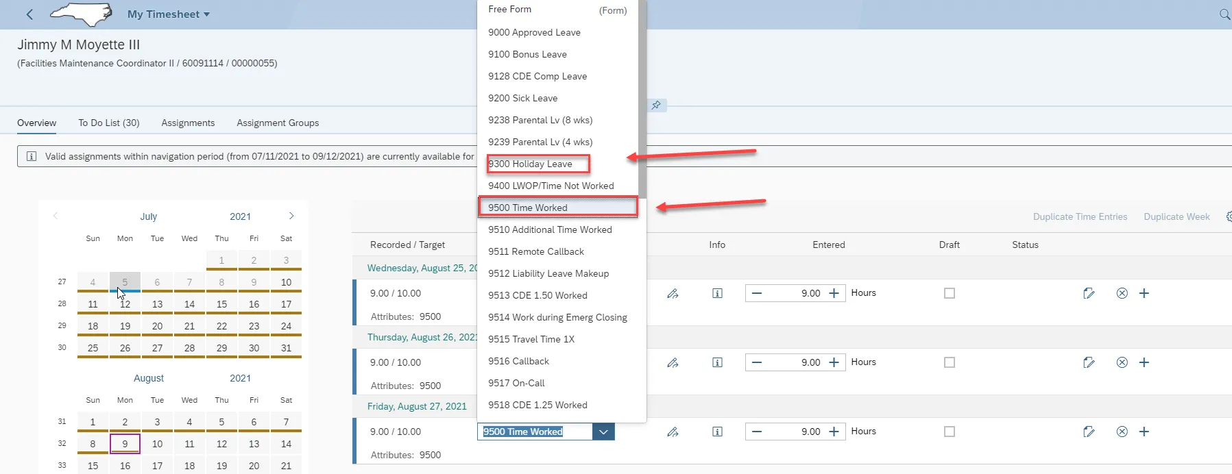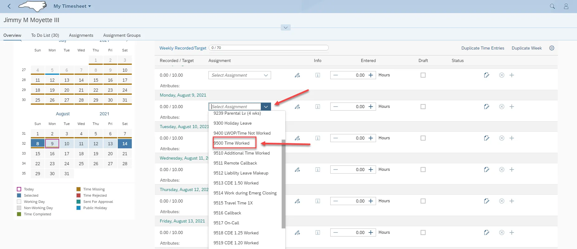 Step 9. Click the drop-down in the Select Assignment field to select an Attendance/Absence type. Select 9500 Time Worked.