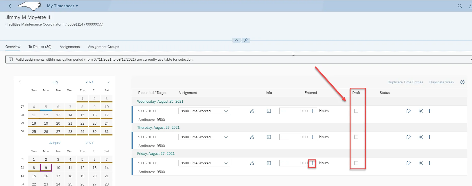 Step 1: Click Monday, August 9, 2021 as the entry to be duplicated.