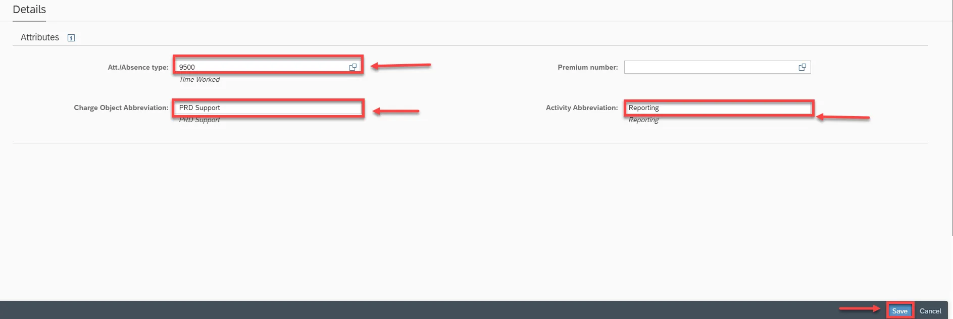 Step 27. Click the matchcode at Att./Absence type and select 9500 and at the Charge Object Abbreviation. We will enter a description in the Charge Object Abbreviation field and the Activity Abbreviation field. Click Save.