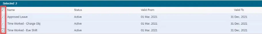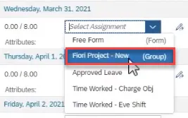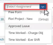 Step 37. Now when you enter records, you can select Att./Absence types independently (Approved Leave, Time Worked-Charge Obj, Time Worked- Eve Shift) or as a Group (Fiori Project-New).