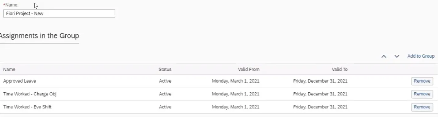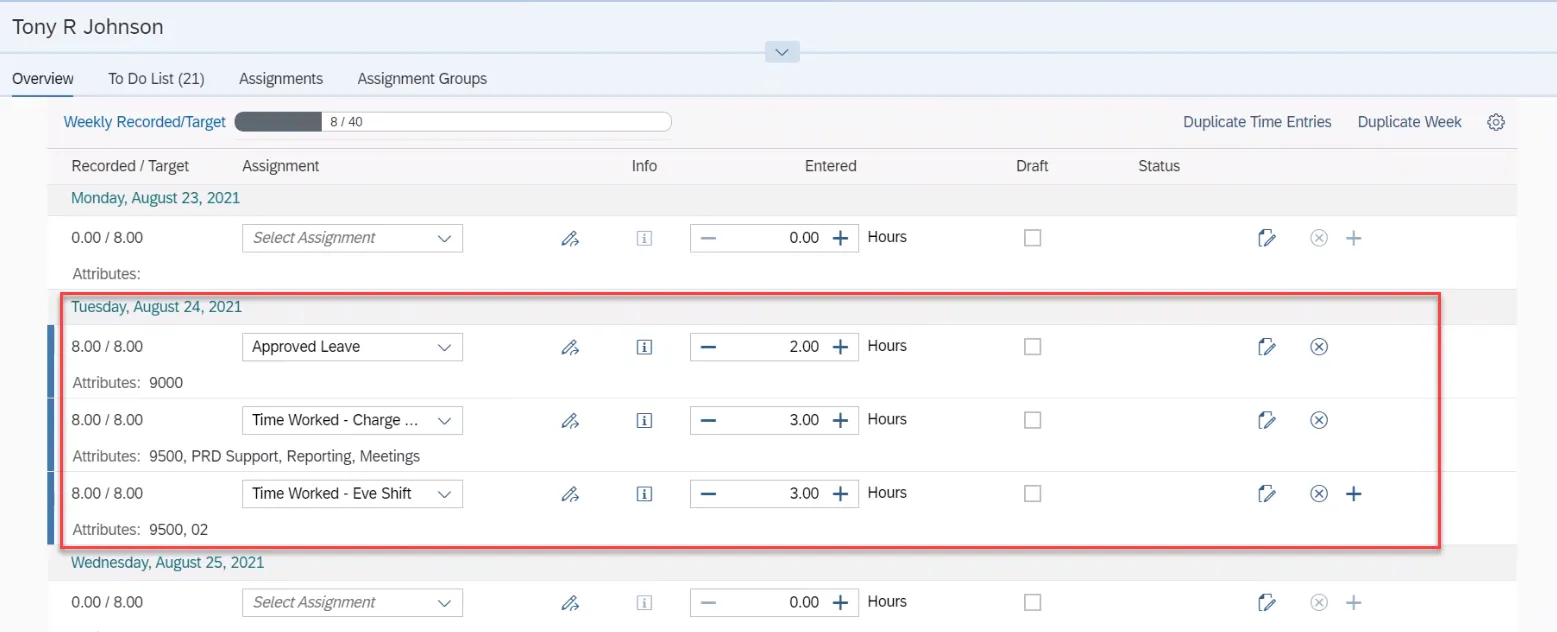 Step 39. When the new assignment group (Fiori Project-New) is selected, the three assignments are listed on a single day. Now you are able to add the appropriate hours for the Att./Abs. types. The use of an assignment group allows an employee to divide their time against shift premium and Charge Objects as needed.