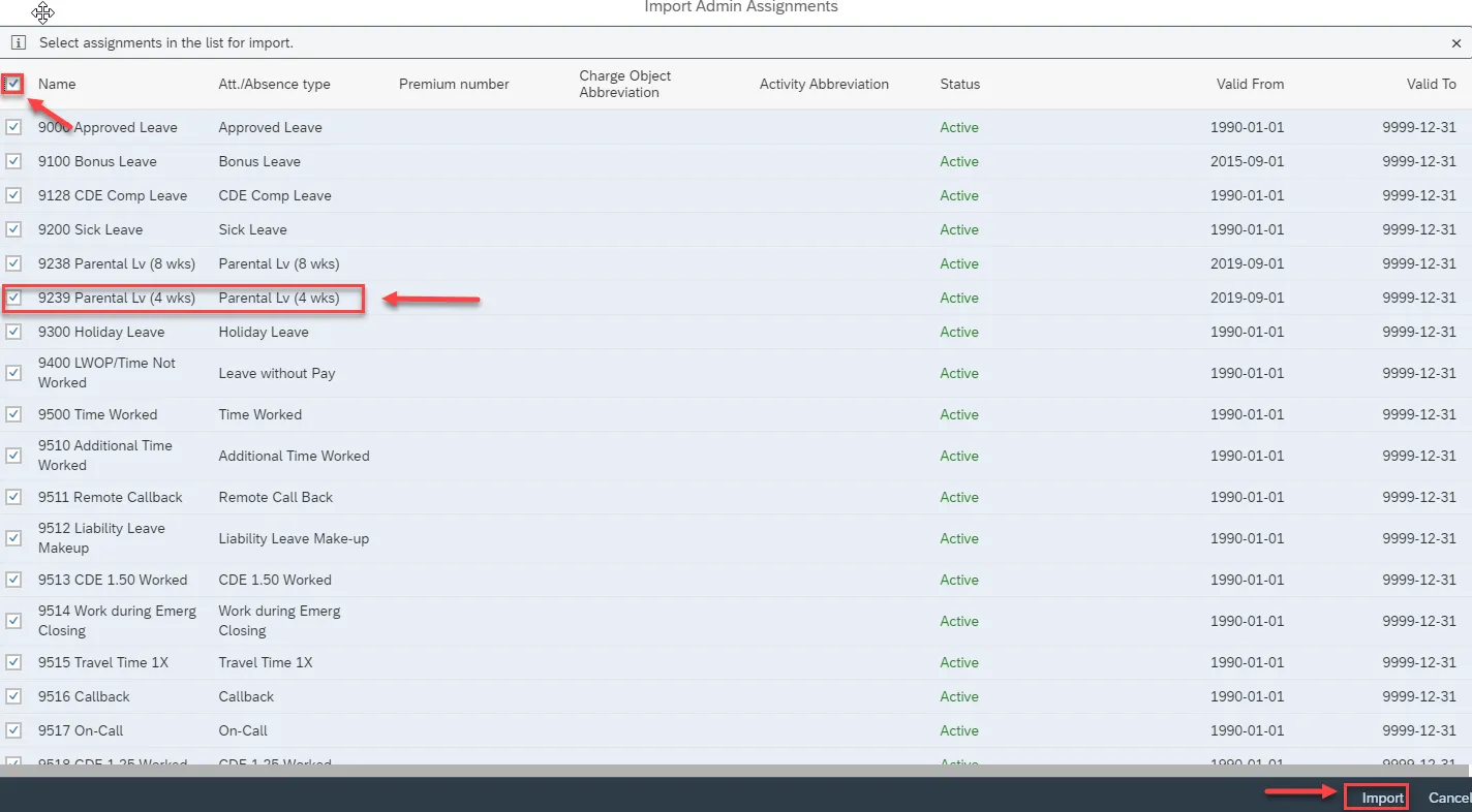 Step 6. At Name, click the check box to select All Attendance/Absence (Att./Abs) types or select them individually. We will select All, but de-select 9239 Parental Lv (4 Weeks). Then click on Import.