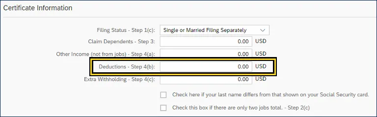 v. Click the field Deductions - Step 4(b) to enter deductions, other than the standard deduction, calculated from the Federal W-4 form.