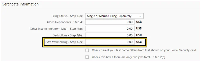 vi. Click the field Extra Withholding – Step 4(c) to enter any additional tax you want withheld each pay period.