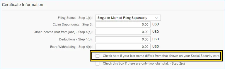 vii. If your last name appears differently on your security card than the name displayed in the top header of the Tax Withholding, click the check box below the Extra Withholding selection.