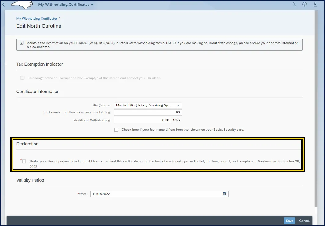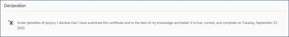 Note: The Declaration field is required when there has been a change in the Certificate information. The checkbox must be checked for the changes to be saved.