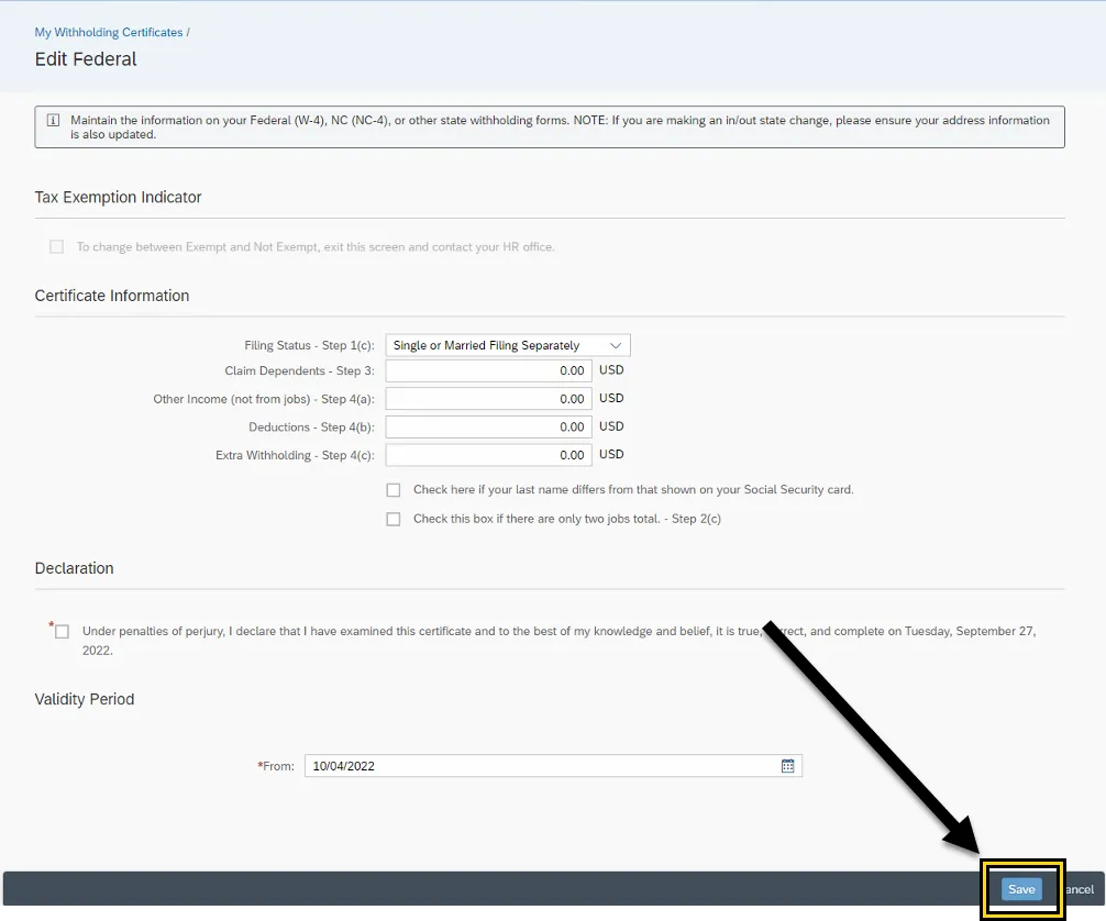 Employees should read the instructions within the Federal W-4 form. The Federal W-4 Employees Withholding Certificate form is available on the IRS website. If an employee has additional questions about the W4 form, please refer to the IRS Frequently Asked Questions. The Federal W-4 Employees Withholding Certificate form & the Federal Form W-4 FAQ’s can also be accessed within the Fiori My Reports & Resources application on the Personal Data card.