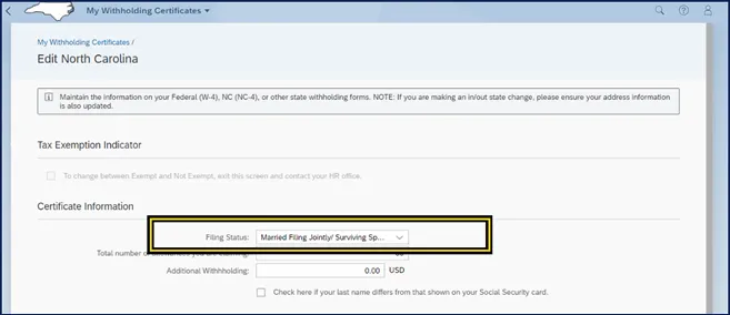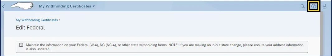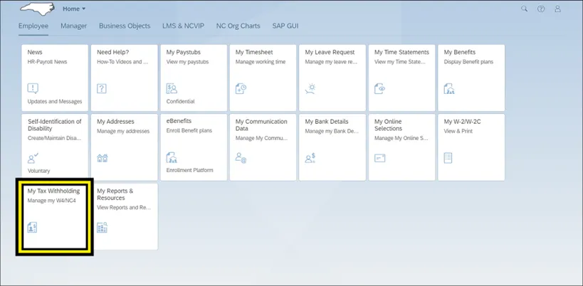 The purpose of this Business Process Procedure is to explain how to access and modify Federal (W-4) and NCDOR (NC-4) Employee’s Withholding Certificates within the Fiori My Tax Withholding application. Fiori applications are accessible via desktop, laptop, and mobile devices.