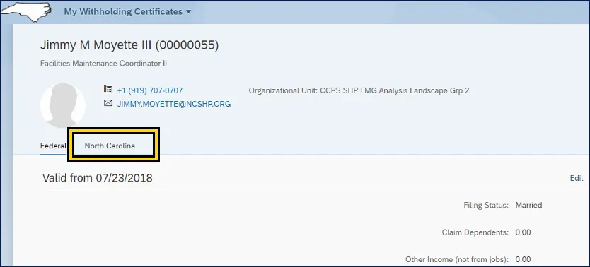 The North Carolina tab delivers Tax Withholding information for the current NCDOR Employees Withholding selections for Filing Status, Total Number of Allowance, and Additional Withholdings.