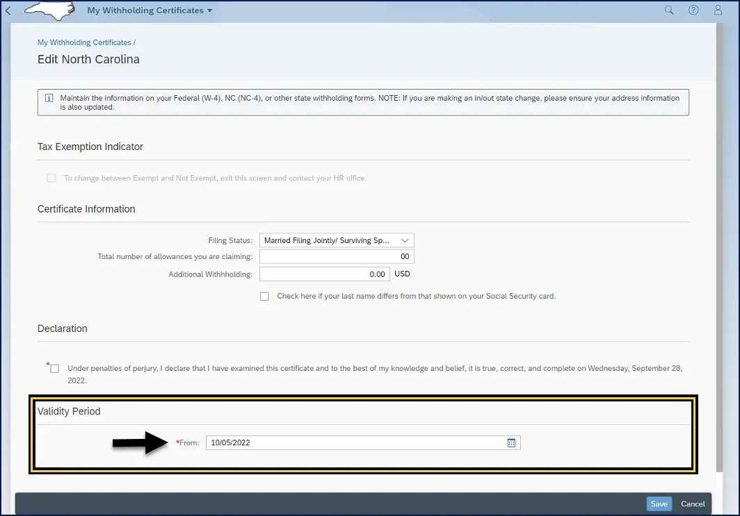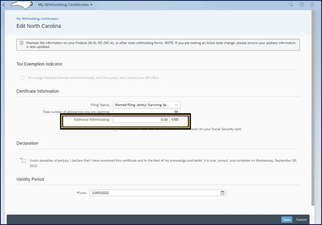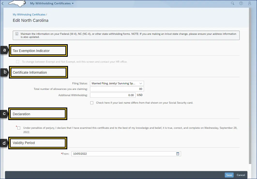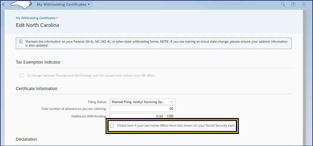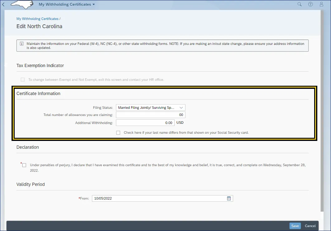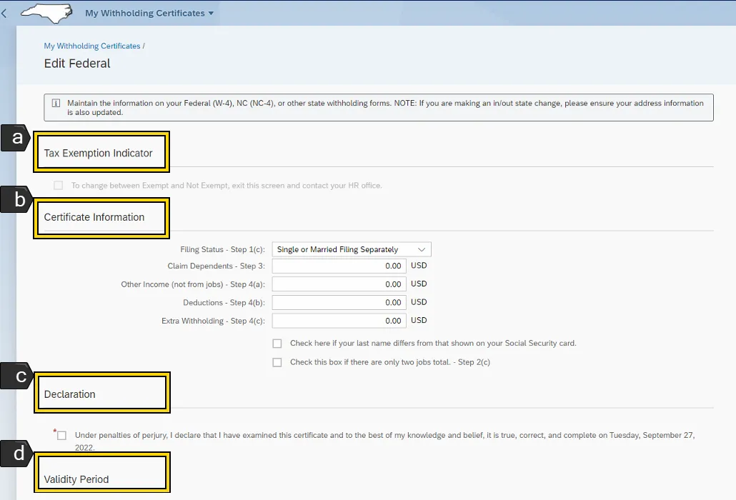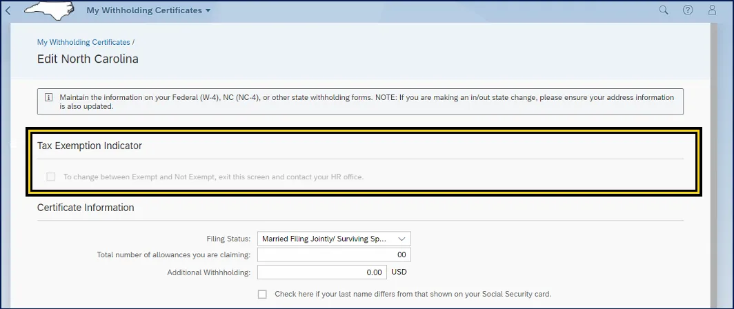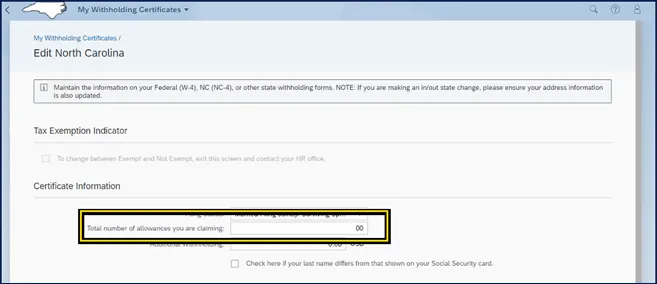 i. Certificate Information area can be edited by the employee. Employees can use the NCDOR forms as all fields are mapped with the same field titles.