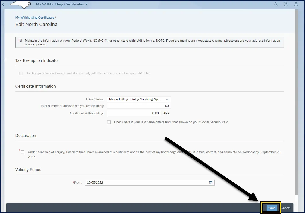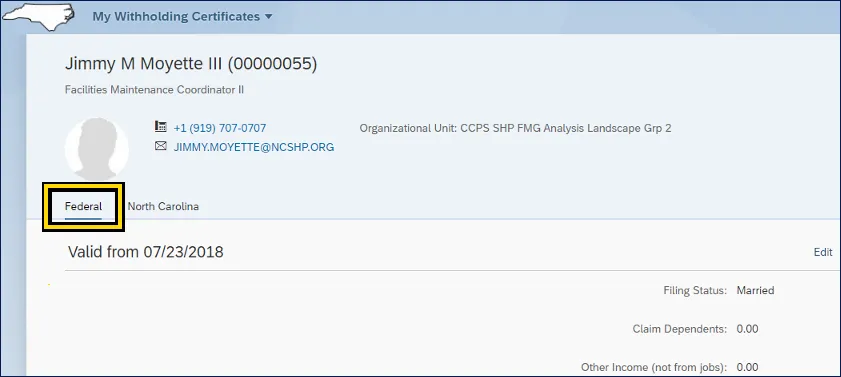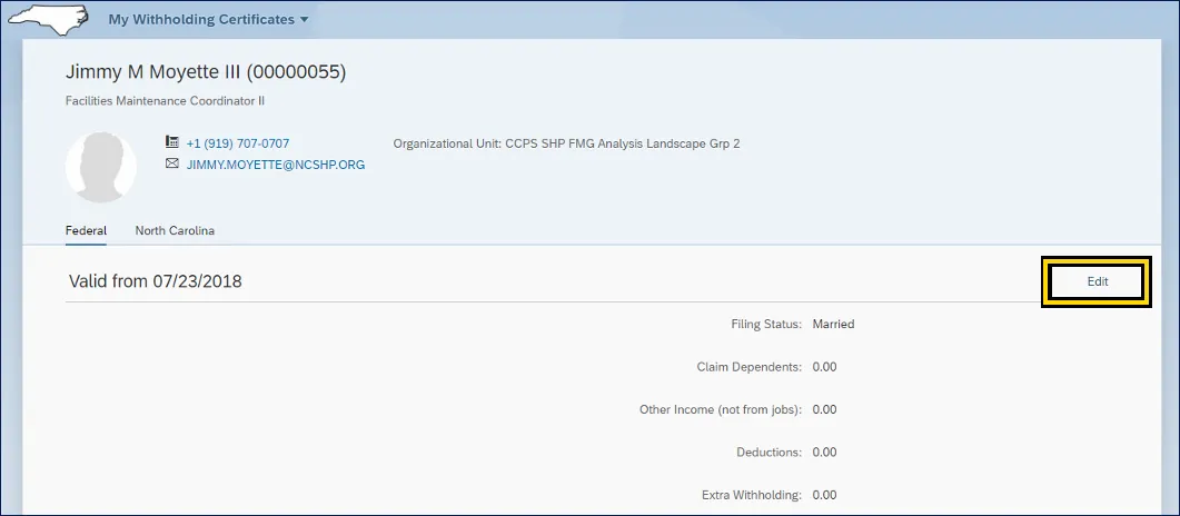 The following steps explain how to maintain the information on the North Carolina Employee’s Withholding Allowance Certificate (NC-4) form. There are 3 steps to complete this process.