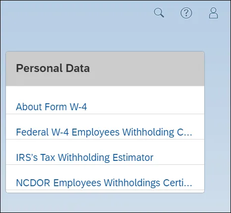 Additional Help documentation, such as the Federal W-4 Employee Withholding Certificate, About Form W-4, or NCDOR Employees Withholdings Certificate can be accessed from the My Reports & Resources My Personal Data card.