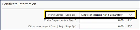 ii. Select the dropdown box for Filing Status -Step 1(c) to select the appropriate filing status from the available options: Single or Married Filing Separately; Married Filing Jointly/ Qualifying Widow; Head of Household.