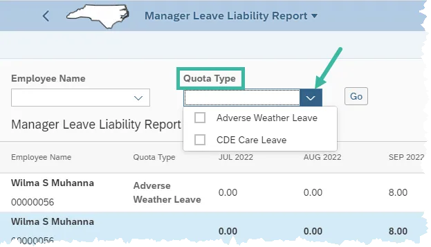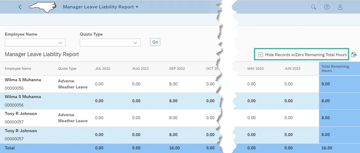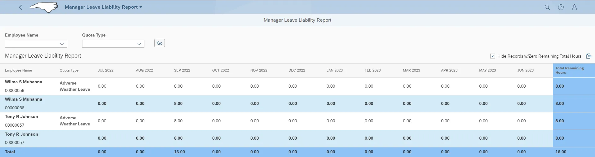 When the Quota Type filter is used to select a quota type outside of the default "ALL", the Hide Records w/Zero Remaining Hours will deselect.